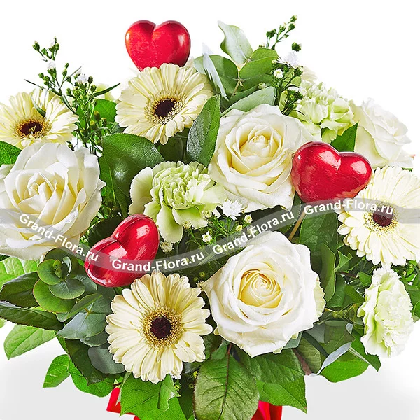 Люкс: роза белая - 7 шт., гербера кремовая - 5 шт., гвоздика зеленая - 3 шт., рускус - 2 шт., гипсофила - 1 шт., эвкалипт - 2 шт., сердце красное (декоративное) - 3 шт., упаковка, бант красный. Примерный размер: 35Х35 см.